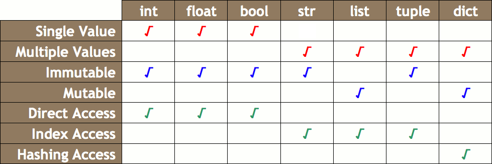 - How Data Is Accessed: A data type can either be accessed directly using the variable name (int, float, bool), using an index (strings, lists, tuples), or by hashing (dictionaries).