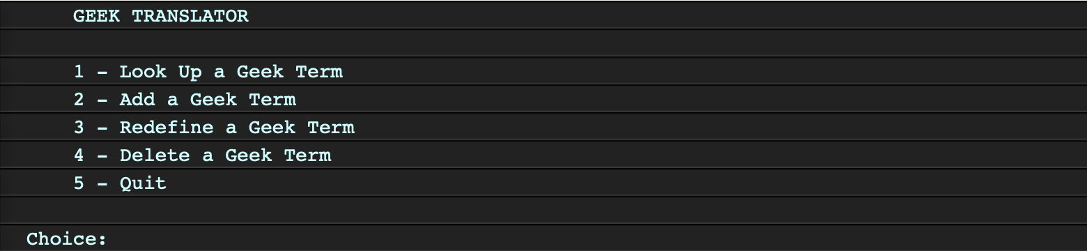 - Add a Geek Term: Should ask the user for the new term. If the term does not already exist in the dictionary, the user should be asked for its definition, then the new term and definition should be added and the message “The term has been added.” displayed. If the term already exists, then display the message “That term already exists! Try redefining it.” The main menu should be displayed again.